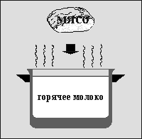 Кусок мяса (горячий или холодный) упал внутрь горячей кастрюли, в которой варится молоко.