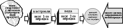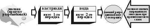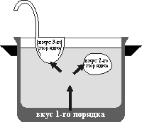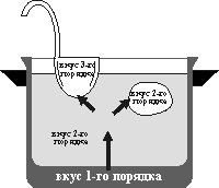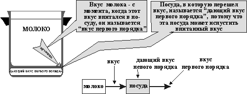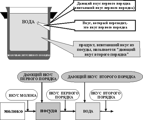 НАПРИМЕР: В воду, которая кипятится в молочной кастрюле, внесли ложку и паревный продукт. Вода имеет вкус 2-го порядка, и когда этот вкус переходит из воды в ложку, то он превращается во вкус 3-го порядка, (переход от продукта к сосуду). Однако при переходе от воды к продукту он остается вкусом 2-го порядка (переход от продукта к продукту).
