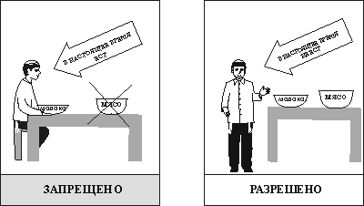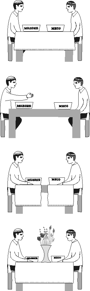 1) 3АПРЕЩЕНО ЕСТЬ МОЛОЧНОЕ БЛЮДО 3А СТОЛОМ, НА КОТОРОМ ЛЕЖИТ МЯСО (и, конечно, - мясо, если на столе находится молоко), - чтобы по ошибке не начать есть их вместе.