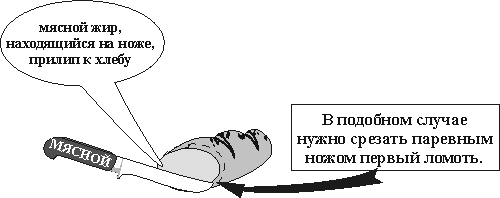 1. НОЖ МЯСНОЙ. Если разрезали хлеб мясным ножом, запрещено есть его за молочной трапезой - из-за опасения, что к нему прилип мясной жир, находящийся на ноже. И то же самое относительно молочного ножа - опасаемся, что к нему прилипли кусочки молочного жира.